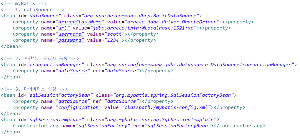 <!-- myBatis --> <!-- 1. dataSource --> <bean id="dataSource" class="org.apache.commons.dbcp.BasicDataSource"> <property name="driverClassName" value="oracle.jdbc.driver.OracleDriver"></property> <property name="url" value="jdbc:oracle:thin:@localhost:1521:xe"></property> <property name="username" value="scott"></property> <property name="password" value="1234"></property> </bean> <!-- 2. 트랜잭션 관리자 등록 --> <bean id="transactionManager" class="org.springframework.jdbc.datasource.DataSourceTransactionManager"> <property name="dataSource" ref="dataSource"></property> </bean> <!-- 3. 마이바티스 설정 --> <bean id="sqlSessionFactoryBean" class="org.mybatis.spring.SqlSessionFactoryBean"> <property name="dataSource" ref="dataSource"></property> <property name="configLocation" value="classpath:/mybatis-config.xml"></property> </bean> <bean id="sqlSessionTemplate" class="org.mybatis.spring.SqlSessionTemplate"> <constructor-arg name="sqlSessionFactory" ref="sqlSessionFactoryBean"></constructor-arg> </bean>