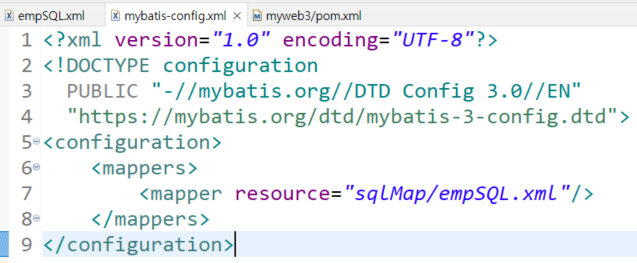 <?xml version="1.0" encoding="UTF-8"?> <!DOCTYPE configuration PUBLIC "-//mybatis.org//DTD Config 3.0//EN" "https://mybatis.org/dtd/mybatis-3-config.dtd"> <configuration> <mappers> <mapper resource="sqlMap/empSQL.xml"/> </mappers> </configuration>