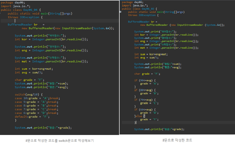 - switch문의 값은 byte,short,char,int와 같은 정수형만 사용가능하다!(7버전부터 string도 가능하지만 모든버전에서의 호환을 위해 정수형으로 알고 있자.